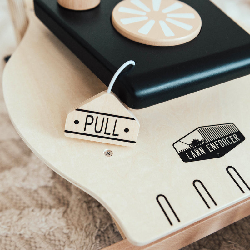 Your little landscaper will love our Lawn Enforcer! They can release the gas cap and fill with pretend gas, then pull the ripcord to start the pretend engine. Turning knobs and chunky wheels add to the charm of this fun mower. The front wheel clackers make sounds when pushed while mowing the carpet in the playroom, or the floor in the kitchen!